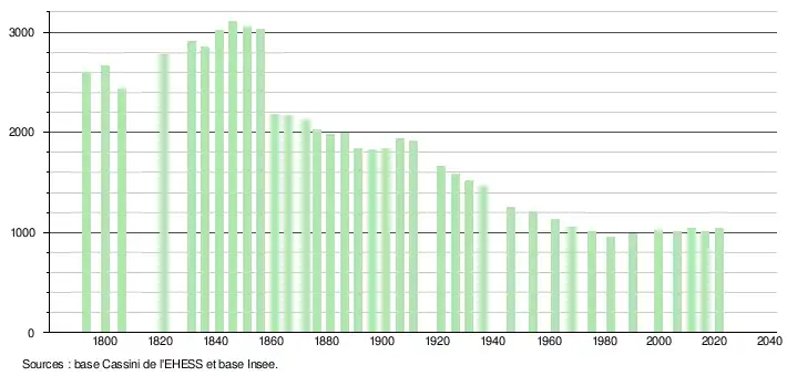 | L'évolution du nombre d'habitants est connue à travers les recensements de la population effectués dans la commune depuis 1793. Pour les communes de moins de 10 000 habitants, une enquête de recensement portant sur toute la population est réalisée tous les cinq ans, les populations légales des années intermédiaires étant quant à elles estimées par interpolation ou extrapolation[40]. Pour la commune, le premier recensement exhaustif entrant dans le cadre du nouveau dispositif a été réalisé en 2006[41]. En 2021, la commune comptait 1 040 habitants[Note 2], en augmentation de 1,56 % par rapport à 2015 (Gironde : +6,88 %, France hors Mayotte : +1,84 %). |
