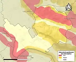 Le retrait-gonflement des sols argileux est susceptible d'engendrer des dommages importants aux bâtiments en cas d’alternance de périodes de sécheresse et de pluie[33]. 60,5 % de la superficie communale est en aléa moyen ou fort (59 % au niveau départemental et 48,5 % au niveau national)[Carte 5]. Depuis le , en application de la loi ELAN, différentes contraintes s'imposent aux vendeurs, maîtres d'ouvrages ou constructeurs de biens situés dans une zone classée en aléa moyen ou fort[Note 7],[34].