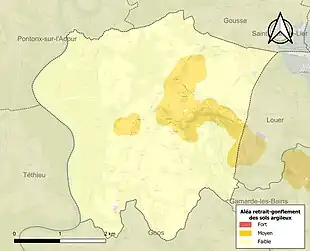 Le retrait-gonflement des sols argileux est susceptible d'engendrer des dommages importants aux bâtiments en cas d’alternance de périodes de sécheresse et de pluie. 13,1 % de la superficie communale est en aléa moyen ou fort (19,2 % au niveau départemental et 48,5 % au niveau national). Sur les 368 bâtiments dénombrés sur la commune en 2019, 116 sont en aléa moyen ou fort, soit 32 %, à comparer aux 17 % au niveau départemental et 54 % au niveau national. Une cartographie de l'exposition du territoire national au retrait gonflement des sols argileux est disponible sur le site du BRGM[21],[Carte 2].