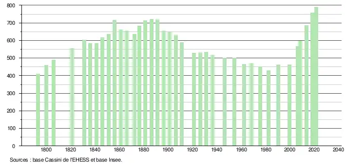 | L'évolution du nombre d'habitants est connue à travers les recensements de la population effectués dans la commune depuis 1793. Pour les communes de moins de 10 000 habitants, une enquête de recensement portant sur toute la population est réalisée tous les cinq ans, les populations légales des années intermédiaires étant quant à elles estimées par interpolation ou extrapolation[23]. Pour la commune, le premier recensement exhaustif entrant dans le cadre du nouveau dispositif a été réalisé en 2008[24]. En 2021, la commune comptait 789 habitants[Note 3], en augmentation de 15,69 % par rapport à 2015 (Landes : +4,9 %, France hors Mayotte : +1,84 %). |