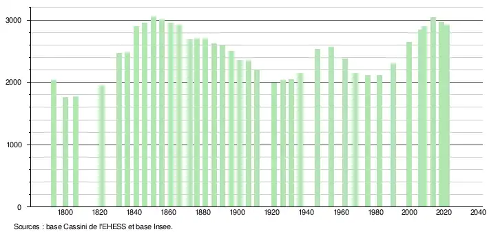 L'évolution du nombre d'habitants est connue à travers les recensements de la population effectués dans la commune depuis 1793. Pour les communes de moins de 10 000 habitants, une enquête de recensement portant sur toute la population est réalisée tous les cinq ans, les populations légales des années intermédiaires étant quant à elles estimées par interpolation ou extrapolation[16]. Pour la commune, le premier recensement exhaustif entrant dans le cadre du nouveau dispositif a été réalisé en 2008[17].