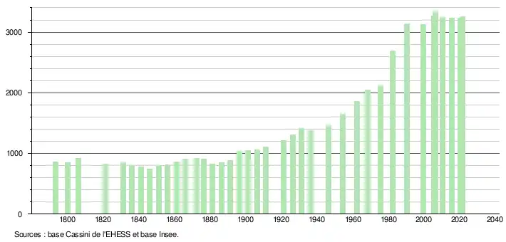 L'évolution du nombre d'habitants est connue à travers les recensements de la population effectués dans la commune depuis 1793. Pour les communes de moins de 10 000 habitants, une enquête de recensement portant sur toute la population est réalisée tous les cinq ans, les populations légales des années intermédiaires étant quant à elles estimées par interpolation ou extrapolation[40]. Pour la commune, le premier recensement exhaustif entrant dans le cadre du nouveau dispositif a été réalisé en 2005[41].