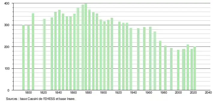 L'évolution du nombre d'habitants est connue à travers les recensements de la population effectués dans la commune depuis 1793. Pour les communes de moins de 10 000 habitants, une enquête de recensement portant sur toute la population est réalisée tous les cinq ans, les populations légales des années intermédiaires étant quant à elles estimées par interpolation ou extrapolation[32]. Pour la commune, le premier recensement exhaustif entrant dans le cadre du nouveau dispositif a été réalisé en 2007[33].