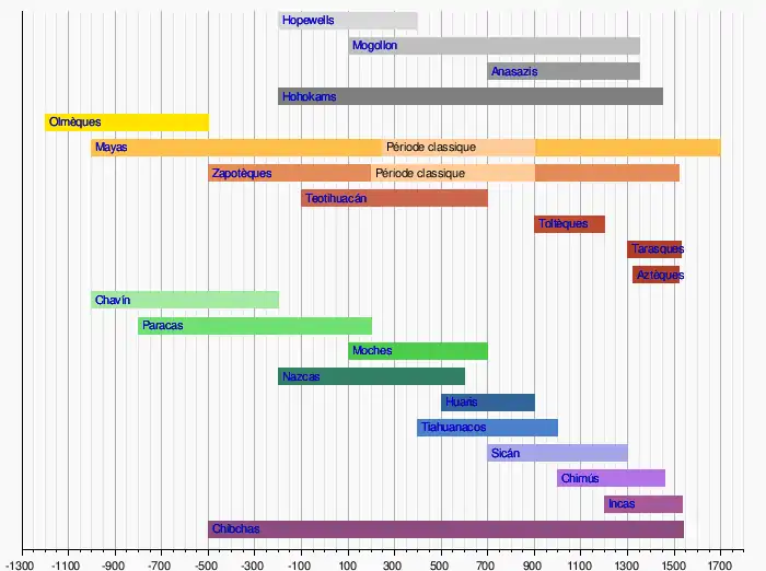 | Mayas | du XIe siècle av. J.-C. au XVIe siècle[11] | De la péninsule du Yucatán (Mexique) au Honduras |