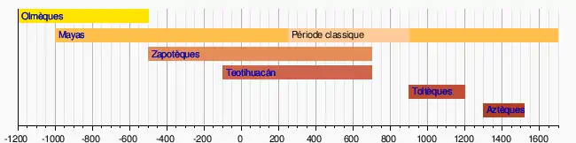 | Olmèques | du XIIIe siècle av. J.-C. au VIe siècle av. J.-C. | Côte du Golfe et le long de la côte Pacifique (État du Guerrero, Oaxaca et Chiapas) jusqu’au sud du Costa Rica |