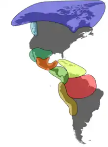 La partie supérieure (nuances de gris) correspond à l'aire nord-américaine.