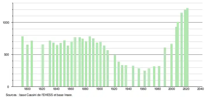 L'évolution du nombre d'habitants est connue à travers les recensements de la population effectués dans la commune depuis 1793. Pour les communes de moins de 10 000 habitants, une enquête de recensement portant sur toute la population est réalisée tous les cinq ans, les populations légales des années intermédiaires étant quant à elles estimées par interpolation ou extrapolation[17]. Pour la commune, le premier recensement exhaustif entrant dans le cadre du nouveau dispositif a été réalisé en 2008[18].