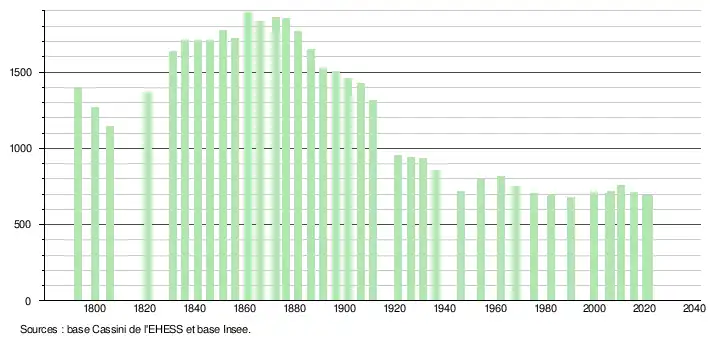 L'évolution du nombre d'habitants est connue à travers les recensements de la population effectués dans la commune depuis 1793. Pour les communes de moins de 10 000 habitants, une enquête de recensement portant sur toute la population est réalisée tous les cinq ans, les populations légales des années intermédiaires étant quant à elles estimées par interpolation ou extrapolation[30]. Pour la commune, le premier recensement exhaustif entrant dans le cadre du nouveau dispositif a été réalisé en 2005[31].