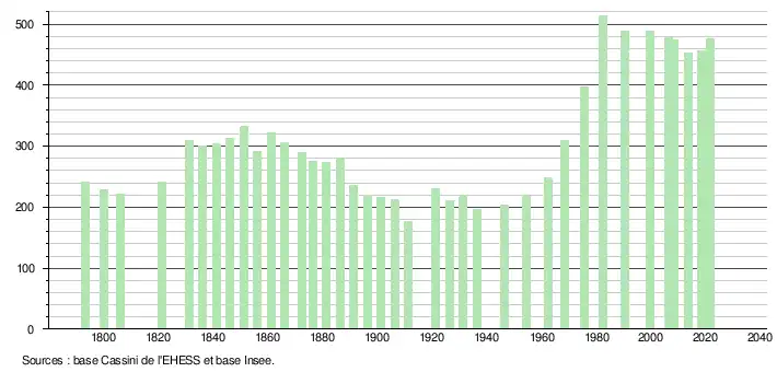 L'évolution du nombre d'habitants est connue à travers les recensements de la population effectués dans la commune depuis 1793. Pour les communes de moins de 10 000 habitants, une enquête de recensement portant sur toute la population est réalisée tous les cinq ans, les populations légales des années intermédiaires étant quant à elles estimées par interpolation ou extrapolation[16]. Pour la commune, le premier recensement exhaustif entrant dans le cadre du nouveau dispositif a été réalisé en 2008[17].