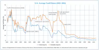 En 1828, le Congrès adopta le « tarif des abominations », qui fixait le prélèvement des droits de douane à un taux historiquement élevé[99]. Cette initiative fut bien accueillie dans le Nord-Est et, dans une moindre mesure, dans le Nord-Ouest, dans la mesure où elle protégeait les industries nationales de la concurrence étrangère[100]. À l'inverse, les planteurs du Sud furent ulcérés par l'augmentation tarifaire qui entraînait une hausse du prix des marchandises importées[99]. Le mécontentement fut particulièrement vif en Caroline du Sud où la classe dominante des planteurs était réputée pour ses positions extrémistes[101]. Dans une proclamation de 1828 intitulée « Exposé et protestation de la Caroline du Sud », qui avait été rédigée en secret par Calhoun, il était affirmé que cet État avait le droit de « nullifier » — c'est-à-dire annuler — la nouvelle législation tarifaire[102]. L'argument de Calhoun visait à démontrer que, si la Constitution autorisait le gouvernement fédéral à imposer des tarifs douaniers pour la collecte de revenus, aucune disposition ne cautionnait la mise en place de tarifs au nom de la protection de l'industrie nationale[103]. Quoique sensible à la défense des prérogatives étatiques, Jackson rejeta le principe de l'annulation[104]. Dans son message au Congrès de 1829, le président se déclara tout au contraire favorable au maintien du tarif, au moins tant que la dette fédérale ne serait pas intégralement remboursée, et soutint un projet d'amendement constitutionnel qui, une fois cet objectif atteint, permettrait de redistribuer le surplus budgétaire ainsi engendré aux États[77].