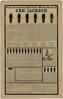 Afin de promouvoir la candidature de leur champion, Van Buren et ses alliés multiplièrent les journaux et les clubs pro-Jackson à travers le pays, tandis que le général recevait volontiers des visiteurs dans sa plantation de l'Hermitage[2]. Les historiens André Kaspi et Hélène Harter notent que « pour faire connaître leurs idées et mobiliser les électeurs, les démocrates multiplient meetings, barbecues, banquets et parades. Ils s'adaptent à l'extension du corps électoral »[3]. La campagne ne fut pas avare d'attaques personnelles en provenance des deux camps même si les candidats, selon la tradition de l'époque, ne faisaient pas eux-mêmes campagne et déléguaient cette tâche à leurs partisans. Jackson fut critiqué pour son passé de marchand d'esclaves et moqué dans divers pamphlets[4]. Son épouse Rachel ne fut pas non plus épargnée par les attaques et fut accusée d'être bigame en raison des circonstances controversées de son mariage avec Jackson[5].