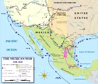 La guerre américano-mexicaine fut l'une des grandes affaires de la présidence Polk. Les États-Unis avaient été le premier pays à reconnaître l'indépendance du Mexique lorsque celui-ci s'était affranchi de la tutelle espagnole en 1821, mais les relations entre Washington et Mexico se détériorèrent à partir des années 1830. Les États-Unis, de même que la France et que la Grande-Bretagne, exigeaient alors du Mexique un traité de réparations pour des actes commis à leur encontre par les autorités et les citoyens mexicains, comme l'arraisonnement de navires américains. Les deux pays se réunirent à l'occasion d'une conférence qui visait à régler le contentieux mais cela n'empêcha pas de nombreux Américains d'accuser le gouvernement mexicain de faire preuve de mauvaise foi dans les négociations. À l'inverse, les Mexicains trouvaient leurs interlocuteurs un peu trop désireux d'acquérir la Haute-Californie et dénonçaient certaines de leurs réclamations comme spécieuses ou notoirement exagérées[57]. Les relations entre les États-Unis et le Mexique, déjà très instables, devinrent exécrables lorsque fut évoqué la possibilité de l'annexion du Texas ; Mexico n'avait en effet jamais reconnu l'établissement de la république et considérait que le Texas faisait toujours partie intégrante de son territoire[58]. Les Texans revendiquaient la propriété de toutes les terres au nord du Río Grande alors que les Mexicains estimaient que la véritable frontière texane était délimitée plus au nord par le Rio Nueces[59]. Les États-Unis disposaient d'une population plus de deux fois supérieure et d'une économie treize fois plus développée que celle du Mexique mais ce dernier n'avait pas l'intention de céder aux revendications des Texans, même si cela devait le conduire à une déclaration de guerre[60]. À la suite de la ratification du traité d'annexion par le Texas en 1845, un conflit armé était perçu des deux côtés de la frontière comme de plus en plus probable[58]. Polk se prépara à cette éventualité en envoyant au Texas une armée dirigée par le général Zachary Taylor. Celui-ci et le commodore David Conner de l'U.S. Navy avaient pour ordre de ne tenter aucune action offensive mais devaient cependant se tenir prêt en cas de déclenchement des hostilités[61].