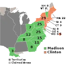 Afin d'accroître ses chances dans le Nord-Est, où la guerre était impopulaire, Madison choisit le gouverneur Elbridge Gerry du Massachusetts en tant que colistier[92]. En dépit des efforts de Clinton et des fédéralistes, Madison fut réélu mais avec une marge plus réduite qu'en 1808 avec 128 votes de grands électeurs contre 89 pour Clinton[91]. Ce dernier réalisa ses meilleurs scores dans les États nordistes même si la victoire de Madison en Pennsylvanie permit aux républicains-démocrates de l'emporter[93]. Après ce scrutin, le Parti fédéraliste, affaibli par son opposition à la guerre, ne regagna jamais son influence d'antan et poursuivit son déclin sur la scène nationale[94].