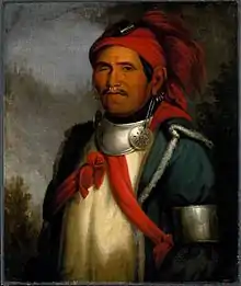 Au moment où Jefferson arriva au pouvoir, le chef chaouanon Tecumseh et son frère Tenskwatawa menaient des raids contre les établissements américains de la vallée de l'Ohio, avec le soutien des marchands anglais du Canada qui approvisionnaient en munitions les Amérindiens. Déterminés à bâtir une confédération des tribus autochtones du Nord-Ouest, les deux frères furent une source d'agacement continuelle pour les colons. Les nations amérindiennes étaient particulièrement sensibles au message de Tenskwatawa qui, au nom de la purification de sa société, en appelait à l'expulsion des colons américains, ces « enfants du démon »[92]. Les succès obtenus par les Amérindiens poussèrent la Grande-Bretagne à envisager la création d'une nation satellite indienne dans certaines parties du territoire américain[93], et les raids furent l'une des causes majeures du déclenchement de la guerre anglo-américaine de 1812.