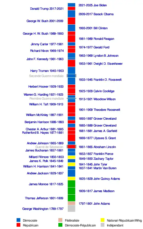 La liste des présidents des États-Unis ci-dessous comprend tous les titulaires de la présidence depuis l'indépendance, du plus ancien au plus récent, ainsi qu'une frise chronologique les présentant d'après leur étiquette politique, du plus récent au plus ancien.