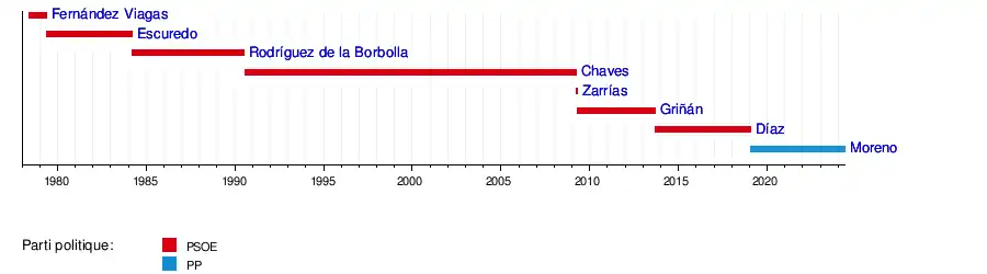 Depuis la mise en œuvre du régime de pré-autonomie en , la Junte d'Andalousie a connu sept présidents, dont six appartenant au Parti socialiste ouvrier espagnol (PSOE). Susana Díaz a été la première et seule femme à occuper cette fonction, tandis que Juan Manuel Moreno est le premier non-socialiste à l'exercer[21]. Au mois d', le vice-président Gaspar Zarrías assume pendant seize jours la gestion des affaires courantes, entre la démission de Manuel Chaves et la prise de fonction de José Antonio Griñán[22].