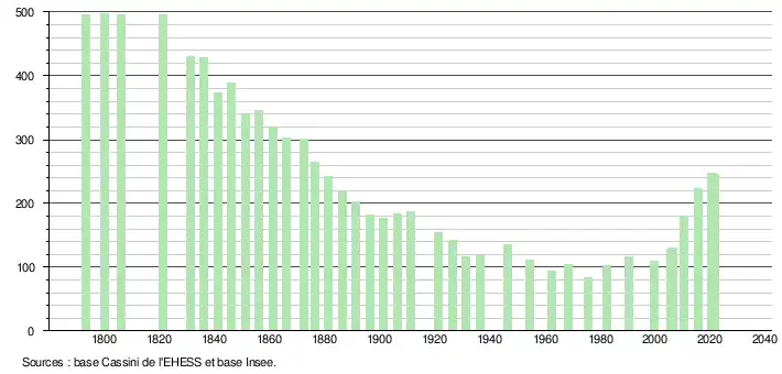 L'évolution du nombre d'habitants est connue à travers les recensements de la population effectués dans la commune depuis 1793. Pour les communes de moins de 10 000 habitants, une enquête de recensement portant sur toute la population est réalisée tous les cinq ans, les populations légales des années intermédiaires étant quant à elles estimées par interpolation ou extrapolation[19]. Pour la commune, le premier recensement exhaustif entrant dans le cadre du nouveau dispositif a été réalisé en 2005[20].