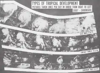 Durant les années 1940, l'aviation a permis de recevoir plus de données dans les vastes zones océaniques et les vols de reconnaissance par les militaires ont permis de rechercher ces systèmes. En 1943, le premier vol dans un ouragan a été effectué par la US Air Force. En 1944, une section dédiée à ce travail a été formé par la US Air Force, travail qui sera plus tard repris par le National Weather Service américain et d'autres services météorologique à travers les régions tropicales. Durant les années 1950, les réseaux de radars météorologiques le long des côtes ont permis de voir la structure des précipitations et le gouvernement américain a mis sur pied le précurseur de l'actuel National Hurricane Center et de sa division de recherche (Atlantic Oceanographic and Meteorological Laboratory)[1]. L'avènement des satellites météorologiques depuis les années 1960, dont TIROS-I fut le premier et des bouées météorologiques, a permis d'obtenir encore plus de données et de mieux suivre le déplacement des cyclones tropicaux[1].