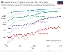 La prévisibilité est la limite de la possibilité de prévoir numériquement les états futurs de l'atmosphère en utilisant un réseau d'observation donné. Elle est définie habituellement par l'échéance en deçà de laquelle il faut s'attendre que l'erreur quadratique moyenne d'un champ prévu soit inférieure à la différence quadratique moyenne entre deux états atmosphériques observés choisis au hasard[6]. En pratique, cela se traduit par la stabilité de la solution de la prévision à un temps X avec les données disponibles, connaissant leurs erreurs intrinsèques et leur distribution spatiale, si une légère variation des valeurs est introduite dans ces données. Le moment où la solution commence à diverger entre les calculs provenant des différentes perturbations devient la limite de prévisibilité du système météorologique.