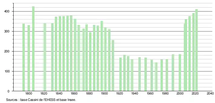 L'évolution du nombre d'habitants est connue à travers les recensements de la population effectués dans la commune depuis 1793. Pour les communes de moins de 10 000 habitants, une enquête de recensement portant sur toute la population est réalisée tous les cinq ans, les populations légales des années intermédiaires étant quant à elles estimées par interpolation ou extrapolation[34]. Pour la commune, le premier recensement exhaustif entrant dans le cadre du nouveau dispositif a été réalisé en 2007[35].