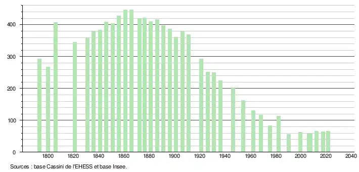 L'évolution du nombre d'habitants est connue à travers les recensements de la population effectués dans la commune depuis 1793. Pour les communes de moins de 10 000 habitants, une enquête de recensement portant sur toute la population est réalisée tous les cinq ans, les populations légales des années intermédiaires étant quant à elles estimées par interpolation ou extrapolation[17]. Pour la commune, le premier recensement exhaustif entrant dans le cadre du nouveau dispositif a été réalisé en 2007[18].