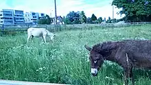 - Au centre, un parc naturel avec du mobilier en bois pour s'y détendre (bancs, transats, plateaux...). Un enclos avec des ânes du Poitou est également présent.