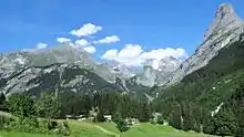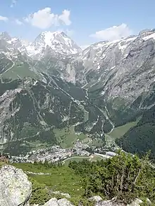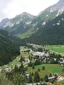 Vue plongeante de Pralognan-la-Vanoise depuis le pied du Grand Marchet au sud-est. | |||||