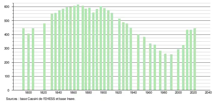 L'évolution du nombre d'habitants est connue à travers les recensements de la population effectués dans la commune depuis 1793. Pour les communes de moins de 10 000 habitants, une enquête de recensement portant sur toute la population est réalisée tous les cinq ans, les populations légales des années intermédiaires étant quant à elles estimées par interpolation ou extrapolation[33]. Pour la commune, le premier recensement exhaustif entrant dans le cadre du nouveau dispositif a été réalisé en 2006[34].