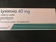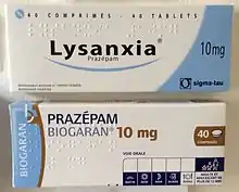 Le prazépam est une molécule appartenant à la famille des benzodiazépines. Elle est commercialisée notamment sous la dénomination commerciale Lysanxia en France, et est utilisée pour ses vertus anxiolytiques[6]. Elle est absorbée très rapidement et le pic de concentration plasmatique est atteint en 30 minutes environ. Cependant la molécule en elle-même est peu active ; c'est son métabolite principal, le N-desméthyldiazépam, qui est responsable de la plupart de ses effets psychotropes et de sa demi-vie très longue[7].