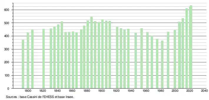 | L'évolution du nombre d'habitants est connue à travers les recensements de la population effectués dans la commune depuis 1793. Pour les communes de moins de 10 000 habitants, une enquête de recensement portant sur toute la population est réalisée tous les cinq ans, les populations légales des années intermédiaires étant quant à elles estimées par interpolation ou extrapolation[28]. Pour la commune, le premier recensement exhaustif entrant dans le cadre du nouveau dispositif a été réalisé en 2005[29]. En 2021, la commune comptait 633 habitants[Note 6], en augmentation de 3,77 % par rapport à 2015 (Aude : +2,47 %, France hors Mayotte : +1,84 %). |