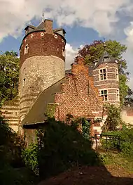 - plus au sud, vers la rue des Frères Mineurs (Minderbroedersstraat), un mur de 40 mètres de long, partiellement intégré à un mur de séparation, et un fragment de tour sur lequel un pavillon de jardin fut bâti en briques au XVIIIe siècle[6], avec des baies de style classique flanquées de pilastres.