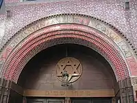 Dans les années 1990, la façade nord en briques rouge-orangées présente un grand portique à arc plein cintre, en briques et pierres, avec des portes en profond retrait. « Cet arc est supporté par trois colonnes sculptées, deux colonnes torsadées et une colonne centrale avec motif à chevrons, chacune avec un chapiteau de style byzantin[39] », et possède au-dessus un couronnement en pierres[37]. Les mots First Roumanian-American Congregation sont gravés en lettres capitales sur l'arc du portique[37].