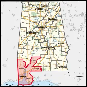 Mobile, Alabama est le cœur de ce district, qui s'étend au nord le long des rivières Tombigbee et Alabama. La charpenterie reste la plus grosse source de contribution à l'économie locale, bien que récemment, les développements de copropriétés de la côte dans le Comté de Baldwin représentent de nouvelles possibilités économiques.