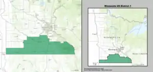 Le 1er district congressionnel du Minnesota s'étend sur le sud du Minnesota, de la frontière avec le Dakota du Sud jusqu'à la frontière avec le Wisconsin. Il s'agit d'un district essentiellement rural bâti sur une forte histoire agricole, bien que celle-ci évolue rapidement en raison de la forte croissance démographique dans la zone statistique combinée de Rochester. Le district abrite également plusieurs des grandes villes de taille moyenne du Minnesota, notamment Rochester, Mankato, Winona, Austin, Owatonna, Albert Lea, Red Wing, New Ulm, Worthington et Lake City. Il est représenté par le Républicain Brad Finstad.