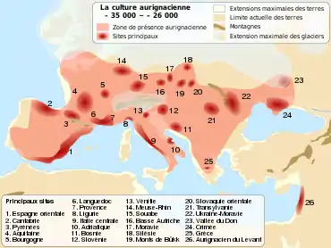 L'Aurignacien est progressivement remplacé par la culture gravettienne, mais on ne sait pas quand l'Aurignacien s'est éteint, car il est mal défini. Des outils « aurignacoïdes » ou « épiaurignaciens » sont datés de 18 à 15 000 ans[10]. On ne sait pas non plus d'où vient le Gravettien, car il diffère considérablement de l'Aurignacien et ne peut donc pas en être issu. Pour rendre compte de la genèse gravettienne, les spécialistes invoquent en Europe centrale une évolution du Szélétien qui existait il y a 41 à 37 000 ans (il s'est développé à partir du Bohunicien) ; ou des cultures ahmariennes ou apparentées, du Proche-Orient ou du Caucase, qui existaient à une époque antérieure à 40 000 ans[11]. On ne connaît pas avec certitude le lieu où la première occurrence de la culture gravettienne est identifiée ; ce pourrait être l'Allemagne il y a environ 37 500 ans[12], ou le dernier abri de roche Buran-Kaya III en Crimée il y a environ 38 à 36 000 ans[13]. Dans les deux cas, l'apparition du Gravettien coïncide avec une baisse de température importante[14].