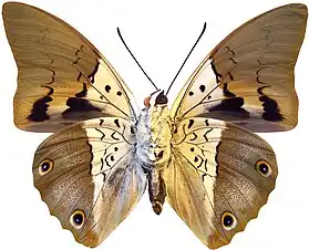 Le revers est beige et marron avec une partie basale beige et une partie distale marron ornée aux ailes postérieures de deux ocelles noirs pupillés de bleu, l'un proche de l'angle anal, l'autre proche de l'apex.