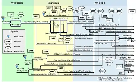 Le presbytérianisme est arrivé dans les colonies anglaises d’Amérique en 1644, date où a été établie la première église presbytérienne, « Christ's First Presbyterian Church », à Hempstead, dans l’État de New York, par le pasteur Richard Denton. Le premier consistoire fut établi en 1706 à Philadelphie, puis deux autres furent créés et les trois consistoires se fédérèrent en un synode en 1717, selon les règles du système presbytéro-synodal de l’Église d’Écosse, puis, en 1789, la croissance de cette église la conduisit à se structurer au tour d’un synode général dit « Assemblée générale » et à devenir l’Église presbytérienne aux États-Unis d'Amérique (Presbyterian Church in the United States of America – PCUSA).