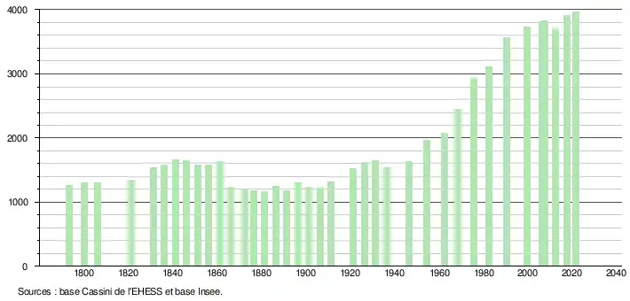 L'évolution du nombre d'habitants est connue à travers les recensements de la population effectués dans la commune depuis 1793. Pour les communes de moins de 10 000 habitants, une enquête de recensement portant sur toute la population est réalisée tous les cinq ans, les populations légales des années intermédiaires étant quant à elles estimées par interpolation ou extrapolation[25]. Pour la commune, le premier recensement exhaustif entrant dans le cadre du nouveau dispositif a été réalisé en 2007[26].
