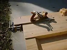 Cales utilisées pour immobiliser une planche en cours de rabotage entre une paire de butées d'établi.