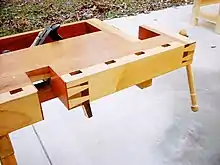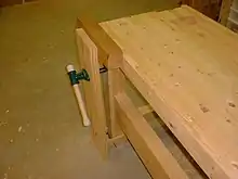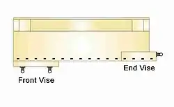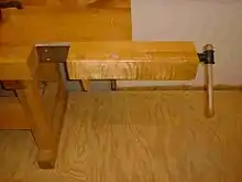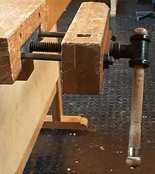 Cette presse à chariot traditionnelle utilise également une grande vis, en bois ou en métal. Il se compose d'un bloc mobile avec un ou plusieurs trous de butée, le bloc mobile se déplace dans une grande mortaise de l'établi. La mâchoire a une face qui entre en contact avec le plateau de l'établi, et les trous de butée sont alignés avec les trous de butée du plateau de l'établi. Les deux principales variétés de cette presse varient selon que l'écrou est monté dans l'établi ou sur le bloc de trous d'entraînement. Lorsque l'écrou est monté sur le bloc de trous, l'installation est plus compliquée et plus coûteuse, mais la vis ne bouge pas lorsque l'étau est utilisé.