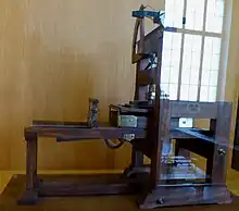 On ne sait pas avec précision à quoi ressemblait la première presse utilisée par Gutenberg. Sans doute s'inspirait-elle largement à la fois du pressoir des vignerons et des diverses presses utilisées par d'autres professions : un montant horizontal transversal, portant sur deux montants verticaux, une vis centrale en bois actionnée par un levier et une platine exerçant la pression.