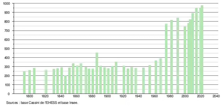 L'évolution du nombre d'habitants est connue à travers les recensements de la population effectués dans la commune depuis 1793. Pour les communes de moins de 10 000 habitants, une enquête de recensement portant sur toute la population est réalisée tous les cinq ans, les populations légales des années intermédiaires étant quant à elles estimées par interpolation ou extrapolation[21]. Pour la commune, le premier recensement exhaustif entrant dans le cadre du nouveau dispositif a été réalisé en 2004[22].