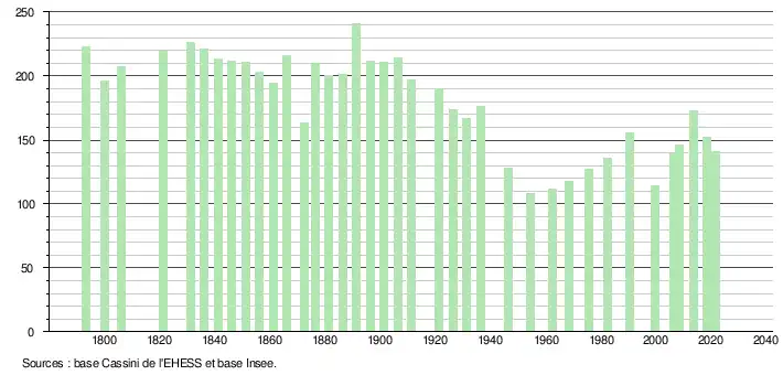 L'évolution du nombre d'habitants est connue à travers les recensements de la population effectués dans la commune depuis 1793. Pour les communes de moins de 10 000 habitants, une enquête de recensement portant sur toute la population est réalisée tous les cinq ans, les populations légales des années intermédiaires étant quant à elles estimées par interpolation ou extrapolation[50]. Pour la commune, le premier recensement exhaustif entrant dans le cadre du nouveau dispositif a été réalisé en 2008[51].