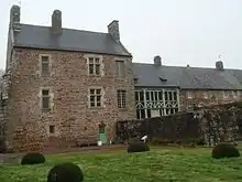 « Tout l'appareil défensif du premier manoir fortifié a pratiquement disparu: évanoui, le plan d'eau; comblés en partie, les fossés; l'enceinte, aux murs étayés de contreforts, est toute coupée de brèches; seul le double porche cintré donne toujours accès dans la vaste cour intérieure. »[6].