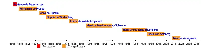 | Bernhard de Lippe-Biesterfeld Né le à Iéna — Mort le à Utrecht | — (31 ans, 7 mois et 24 jours) | Juliana, reine des Pays-Bas | Maison de Lippe-Biesterfeld (fils de Bernard de Lippe) |