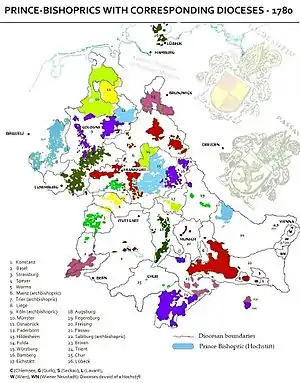 La matricule d'Empire, arrêtée à la diète de Worms en 1521, recense les trois électeurs ecclésiastiques et quatre États impériaux au rang de princes-archevêques (Erzstifte) : à Magdebourg (avec Halberstadt), Salzbourg, Besançon et Brême. De plus, elle connaît au total 46 princes-évêques catholiques, par exemple à Bâle, Cambrai (Cambrésis), Genève, Hildesheim, Liège (Lüttich), Münster, Paderborn, Sion (Valais), Strasbourg, Trente et Utrecht, ainsi que les Trois-Évêchés lorrains de Metz, Toul et Verdun. Le nombre a été réduit considérablement au cours de la réforme protestante : après la paix de Westphalie de 1648, beaucoup de principautés épiscopales ont été sécularisées, avant tout à l'avantage des grands États tels que le Brandebourg-Prusse. 23 d'entre elles resteraient, parmi lesquelles l'évêché protestant de Lübeck et la principauté épiscopale d'Osnabrück gouverné alternativement par des évêques catholiques et luthériens.