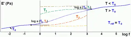 Le principe de superposition temps-température permet, dans l’hypothèse de simplicité thermorhéologique (tous les temps caractéristiques présentent la même loi de variation avec la température)[1], à partir d’une fenêtre spectrale initiale [f1, f2] et d’une série d’isothermes dans cette fenêtre, un calcul des courbes maîtresses d’un matériau qui s’étendent sur une plage de fréquence plus large. Une température arbitraire, T0, est prise comme référence pour fixer l’échelle des fréquences (la courbe à cette température ne subit aucune translation).