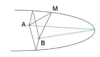 En effet si, dans la plupart des cas, on rencontre des chemins dont la durée de parcours est minimale, il ne faut pas oublier pour autant que d'autres situations peuvent exister. Par exemple, pour aller d'un point A à un point B situés à l'intérieur du miroir concave représenté ci-contre, en se réfléchissant une seule fois sur la surface, la lumière peut emprunter deux parcours de durée minimale (en rouge) et un parcours de durée maximale (en vert) parmi les parcours constitués de deux segments AM et BM. L'étude de la longueur du chemin ferait apparaître trois extrema locaux, deux minima et un maximum, pour ce type de trajets.