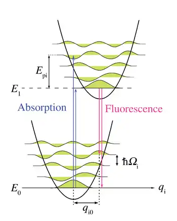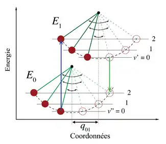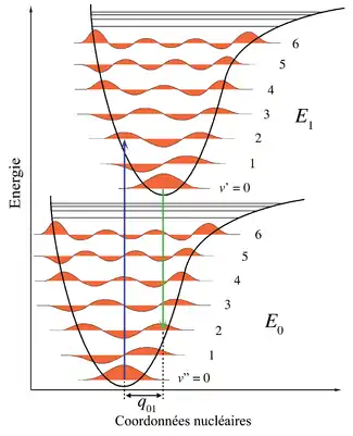 Dans la description quantique, les niveaux et fonctions d'ondes vibrationnels sont ceux des oscillateurs harmoniques quantiques, ou d'approximations plus complexes de l'énergie potentielle des molécules, comme le potentiel de Morse. La figure 1 illustre le principe de Franck-Condon pour les transitions vibroniques dans une molécule avec des fonctions d'énergie potentielle de type Morse dans un état électronique fondamental et un excité. Dans l'approximation des températures basses, la molécule commence au niveau vibrationnel v = 0 de l'état électronique fondamental et par absorption d'un photon d'énergie adéquate, transite vers un état électronique excité. La configuration électronique du nouvel état peut provoquer un décalage de la position d'équilibre des noyaux constituant une molécule. Dans la figure, ce décalage dans les coordonnées atomiques entre l'état fondamental et le premier état excité est nommé q01. Dans le cas le plus simple de la molécule diatomique, l'axe des coordonnées nucléaires réfère à la séparation internucléaire. La transition vibronique est indiquée par une flèche verticale en raison du postulat de la constance des coordonnées nucléaires durant la transition. La probabilité que la molécule puisse se trouver finalement dans un niveau vibrationnel particulier est proportionnelle au carré du recouvrement (vertical) des fonctions d'ondes vibrationnelles des états original et final (voir la formulation quantique dans la partie dédiée ci-dessous). Dans l'état électronique excité, les molécules se relaxent rapidement dans le niveau vibrationnel le plus bas (loi de Kasha), et à partir de là rejoignent l'état électronique de plus basse énergie par émission photonique. Le principe de Franck-Condon s'applique de manière égale à l'absorption et à la fluorescence.