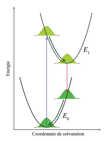 Dans le principe de Franck-Condon original, après la transition électronique, les molécules se trouvant dans des états vibrationnels plus énergétiques commencent immédiatement à relaxer vers l'état vibrationnel le plus bas. Dans le cas de la solvatation, les molécules de solvant essaieront immédiatement de se réarranger afin de minimiser l'énergie d'interaction. Le taux de relaxation du solvant dépend de sa viscosité. Considérant que le temps de relaxation du solvant est court comparé au temps de vie de l'état électronique excité, l'émission se fera depuis l'état d'énergie le plus bas de l'état électronique excité du solvant. Pour des solvants à petites molécules, comme l'eau ou le méthanol à température ambiante, le temps de relaxation du solvant est de l'ordre de quelques dizaines de picosecondes alors que les temps de vie des états excités des chromophores vont des quelques picosecondes à quelques nanosecondes. Immédiatement après la transition vers l'état électronique fondamental, les molécules de solvant doivent aussi se réarranger afin de s'accorder à la nouvelle configuration électronique du chromophore. La figure 6 illustre le principe de Franck-Condon appliqué à la solvatation. Lorsque la solution est éclairée par une lumière correspondant à l'énergie de transition électronique, certains chromophores se trouveront dans l'état excité. Dans ce groupe, il y aura une distribution statistique des énergies d'interaction solvant-chromophore, représentée dans la figure par une fonction de distribution gaussienne. L'interaction solvant-chromophore est dessinée comme étant un potentiel parabolique dans les deux états électroniques. Les transitions électroniques étant essentiellement instantanées sur l'échelle de temps du mouvement du solvant (flèche verticale), l'ensemble des chromophores dans un état excité est immédiatement loin de l'équilibre. Le réarrangement des molécules de solvant selon la nouvelle courbe d'énergie potentielle est représenté par le flèches courbes dans la figure 6. Remarquons que lorsque les transitions électroniques sont quantifiées, l'énergie d'interaction chromophore-solvant est traitée comme un continuum classique en raison du nombre important de molécules concernées. Bien que l'émission soit décrite comme allant se produire à partir du minimum du potentiel d'interaction solvant-chromophore de l'état excité, une émission significative peut se produire avant d'atteindre l'équilibre lorsque la viscosité du solvant est importante ou que le temps de vie de l'état excité est court. La différence d'énergie entre les photons émis et absorbés décrits dans la figure 6 est la contribution de la solvatation au déplacement de Stokes.